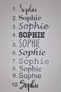 Möchtest du gerne einen liebevollen, handgefertigten Artikel von mir personalisiert haben? Dann suche dir eine Schrift und eine Farbe aus und mach dein Geschenk zum Unikat.